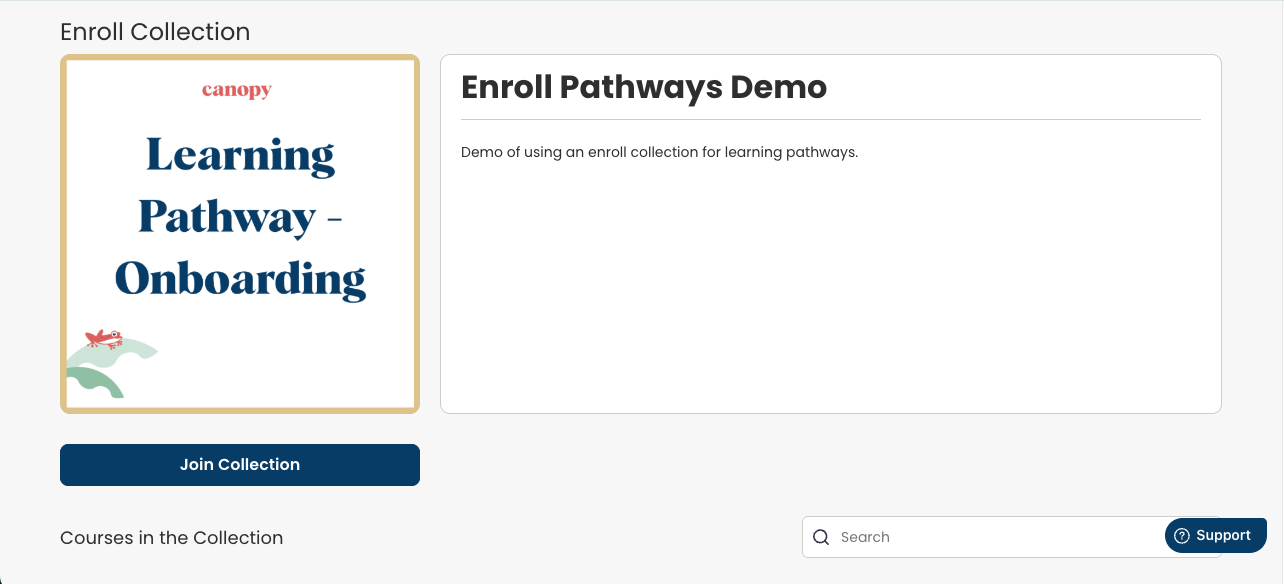Any collection that has been shared to the Course Catalog can be joined by a learner. To join, select a collection's card to preview the included content and click 'Join Collection'.