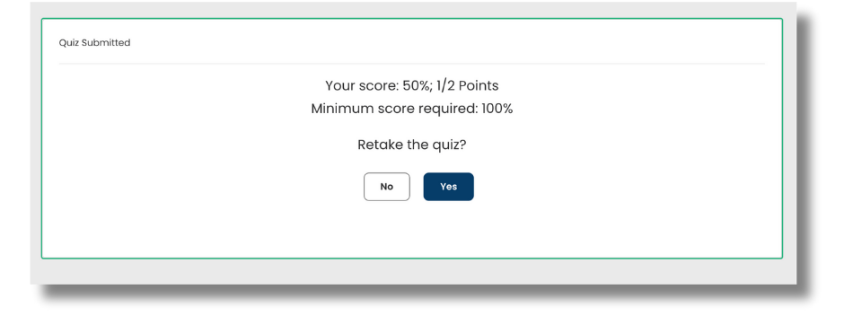 • When Allow 1 Retake is enabled. After completing their first attempt, learners will see their overall score and can choose to retake the quiz. If the learner does not meet the minimum score requirement on their second attempt, they'll need an instructor to reset the quiz.