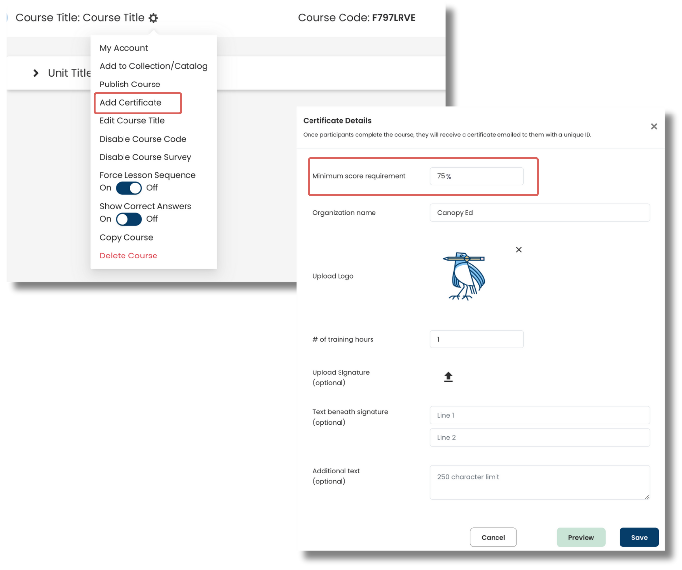 As an instructor, set a minimum score requirement on a quiz or course. Learners will need to earn at least the minimum score required to receive quiz credit or the course certificate.